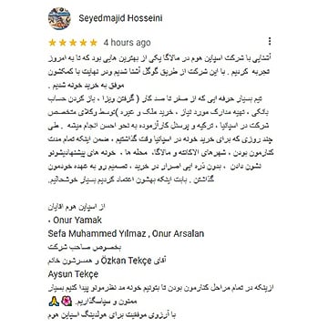 Getting to know Spain Homes in Malaga was one of the best experiences we have ever had. We got to know this company through Google and finally, we managed to buy a house with their help. A very professional team, from zero to a hundred tasks (getting a visa, opening a bank account, preparing the required documents, buying a property, etc.) are done well by the company's expert lawyers in Spain, Turkey, and experienced personnel. During the few days that we took time to buy a house in Spain, while being by our side the whole time, showing the cities of Alicante and Malaga, their neighborhoods, and the houses they suggested, leaving the decision to ourselves without any insistence on the purchase. We are very happy that we trusted them.